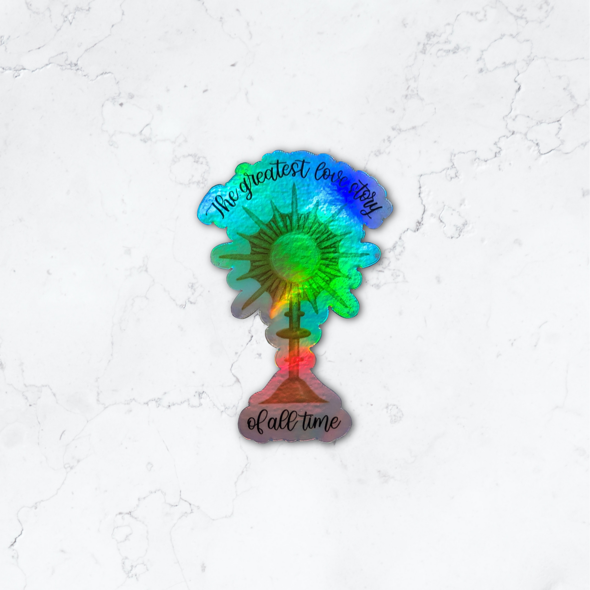 Let this sticker, based off the quote "the greatest love story of all time is contained in a tiny white Host," from Venerable Fulton Sheen, be a reminder of the true presence of Jesus in the Blessed Sacrament, where he is waiting patiently for us.