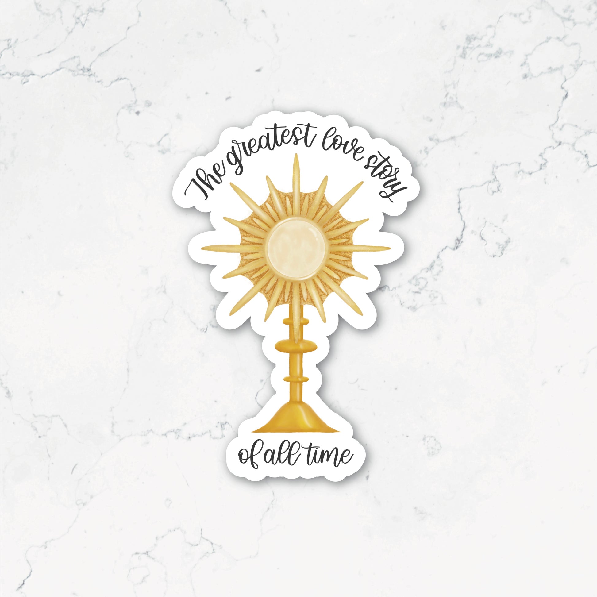 Let this magnet, based off the quote "the greatest love story of all time is contained in a tiny white Host," from Venerable Fulton Sheen, be a reminder of the true presence of Jesus in the Blessed Sacrament, where he is waiting patiently for us.