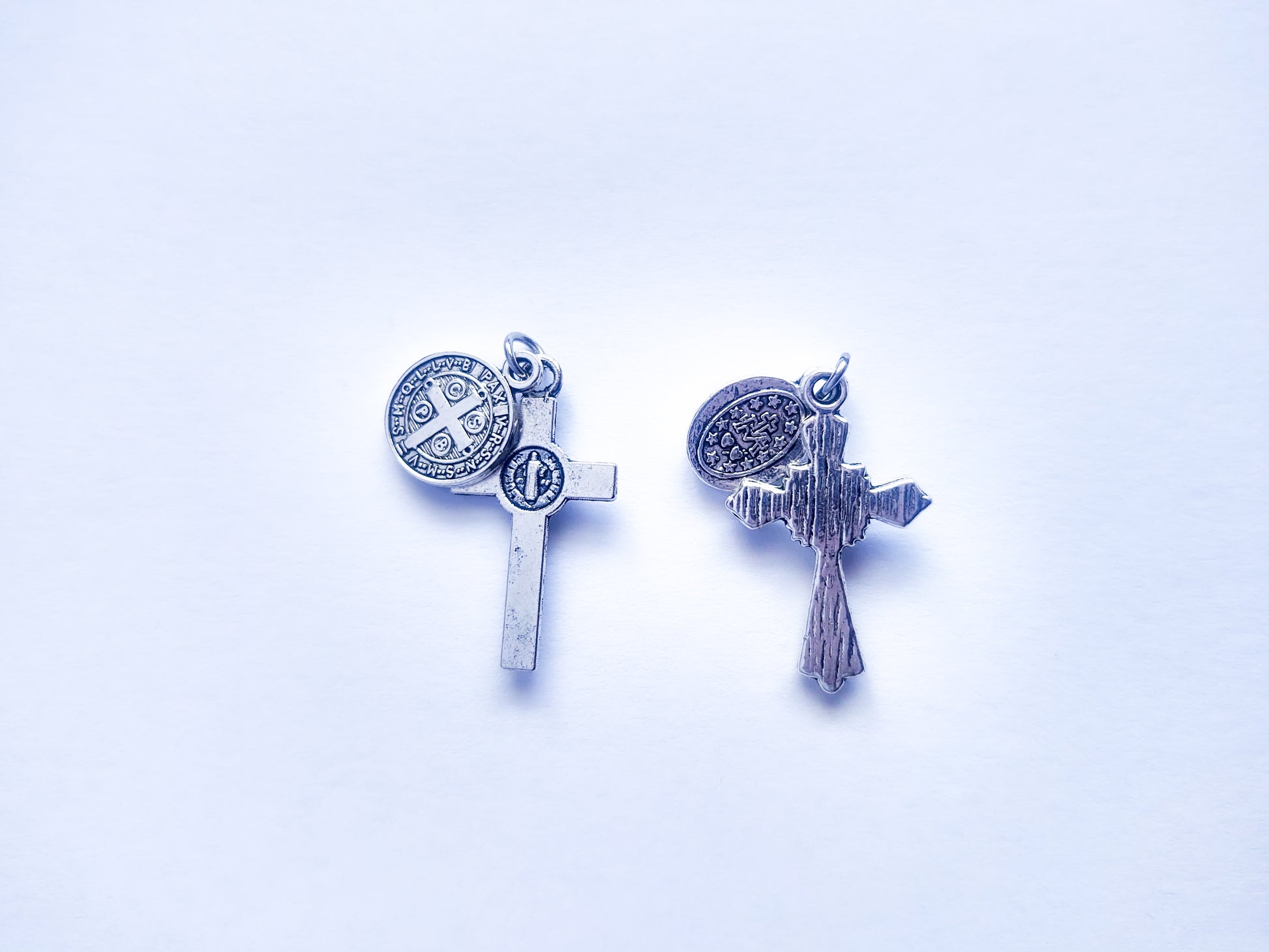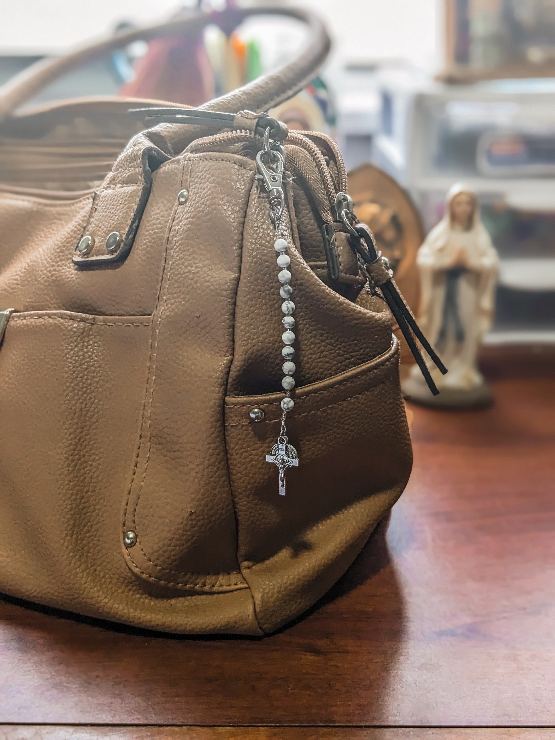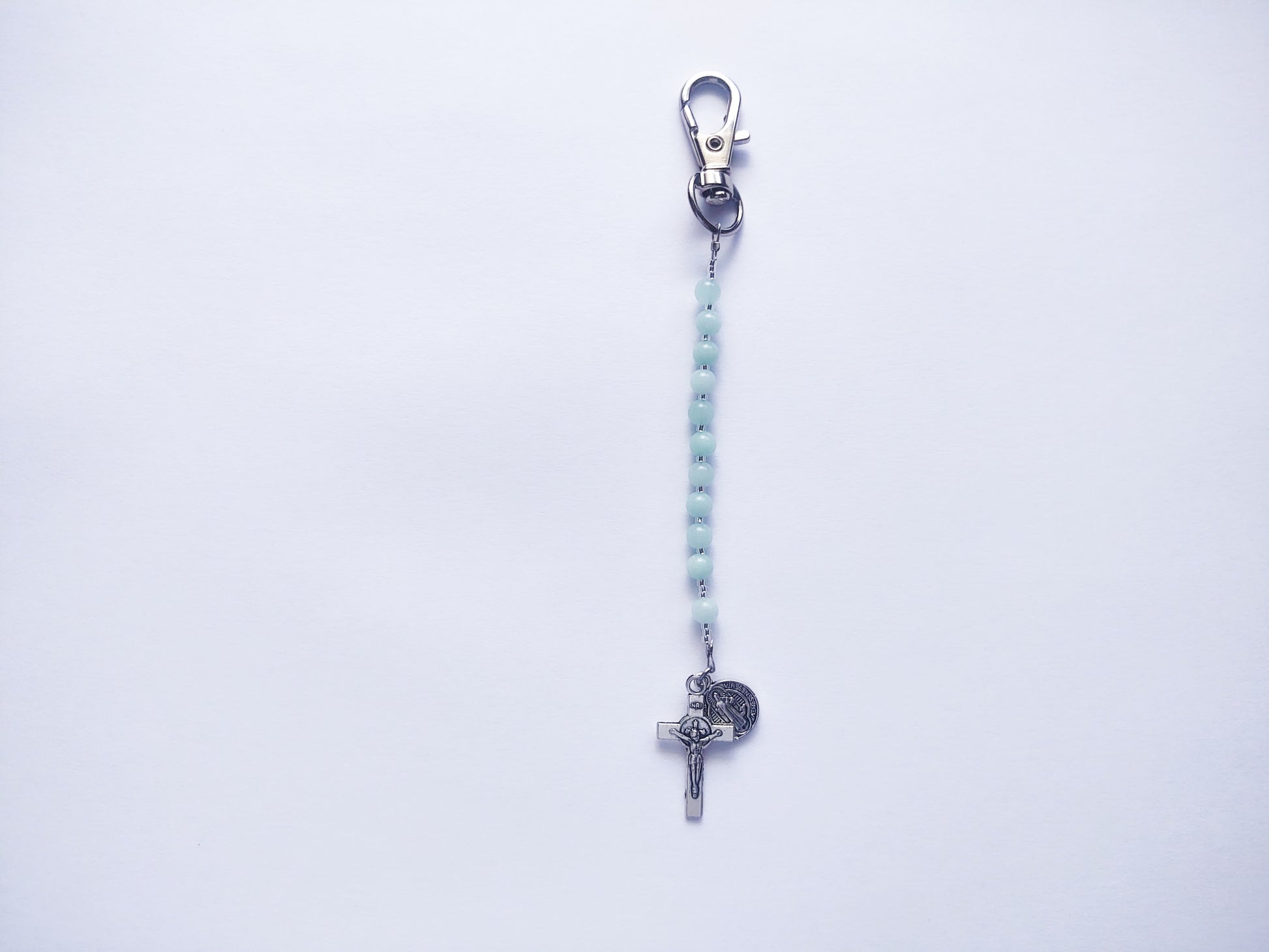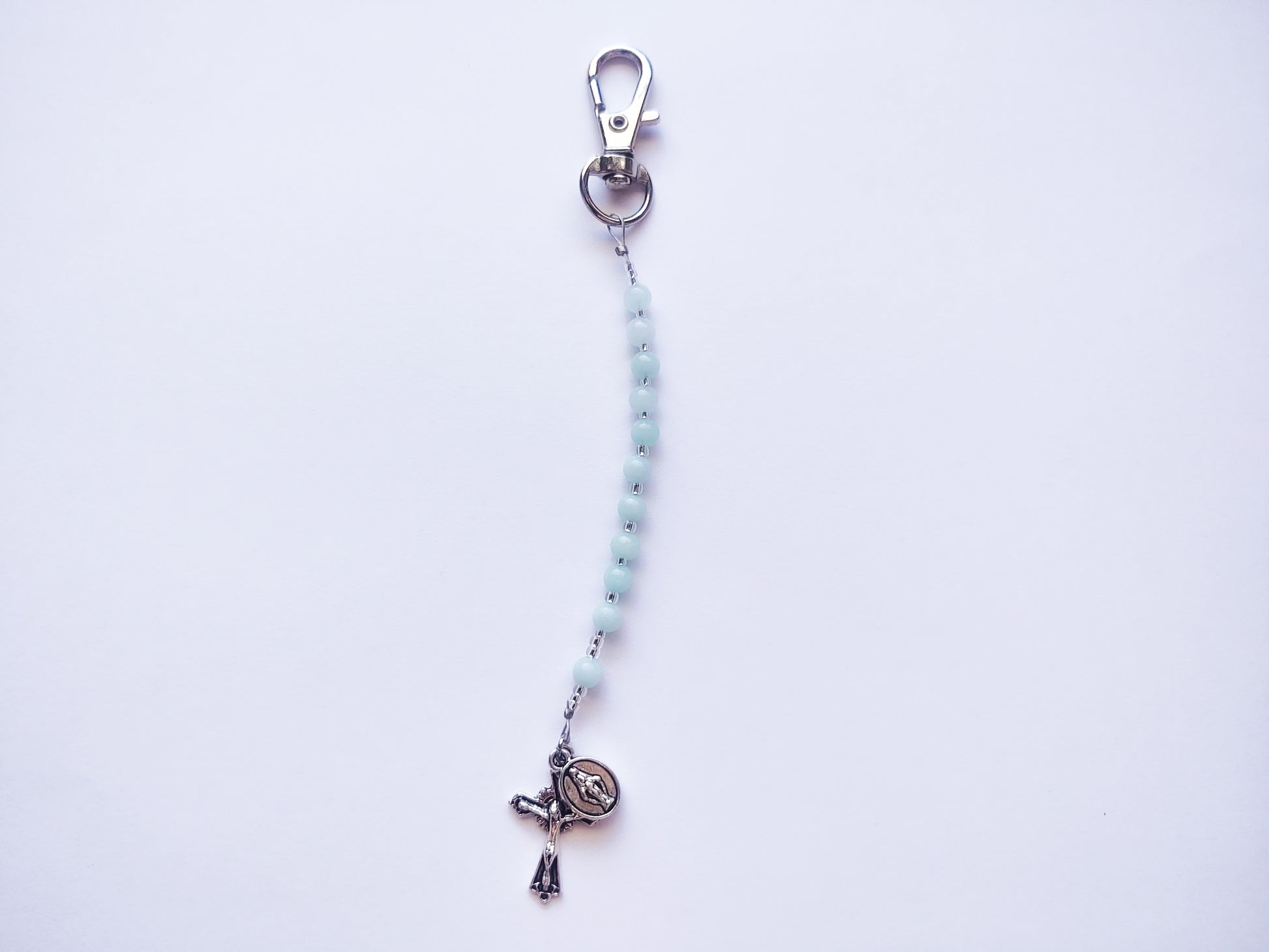 This handmade decade rosary keychain, featuring sky blue beads, is perfect for keeping our Mother Mary close at all times! Features a convenient swivel hook clasp for easy removal whenever you want to pray with it. Keep it on your keys, purse, backpack, and more! Measures 5 inches long.